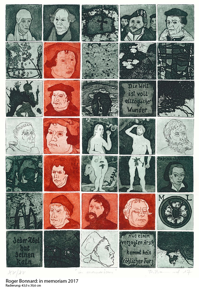 Mit der Wahl ihres Titels versteht sie sich als Beitrag zum 500. Jahrestag der Reformation, freilich in zwangloser Form, die allen zehn beteiligten Thüringer Künstlern erlaubt, sich in ihrer ganz persönlichen Sicht und Handschrift kreativ zu äußern. Alle Blätter werden wieder in eine gleichnamige Ausstellung integriert, die im unmittelbaren Umfeld des Reformationsjubiläums am 3. November 2017 im Kulturgut Quellenhof in Garbisdorf eröffnet wird, begleitet von der nunmehr bereits 14. Ausgabe der „Göpfersdorfer Kunstblätter“, die im E. Reinhold Verlag Altenburg erscheinen und in denen auch dieses Mal alle gezeigten Arbeiten dokumentiert und abgebildet werden. Wörtlich hatte der Reformator verkündet: „Die Welt ist voller Mirakel und Wunderwerk, so da täglich geschehen.“ Zu diesen häufig überraschenden Wundern gehören nicht zuletzt die Werke der Kunst. So nimmt es auch kaum wunder, wenn der Regisseur Federico Fellini in einem aufschlussreichen Gespräch mit Georges Simenon bekannte: „Ich glaube, die Kunst ist die Möglichkeit, die Niederlage in einen Sieg, die Traurigkeit in Glück zu verwandeln. Die Kunst ist ein Wunder.“ Und es würde die Herausgeber sehr verwundern, wenn die lebhafte Resonanz, welche die erwähnte Rilke-Mappe fand, nicht auch dem neuen Vorhaben beschieden wäre.