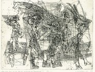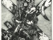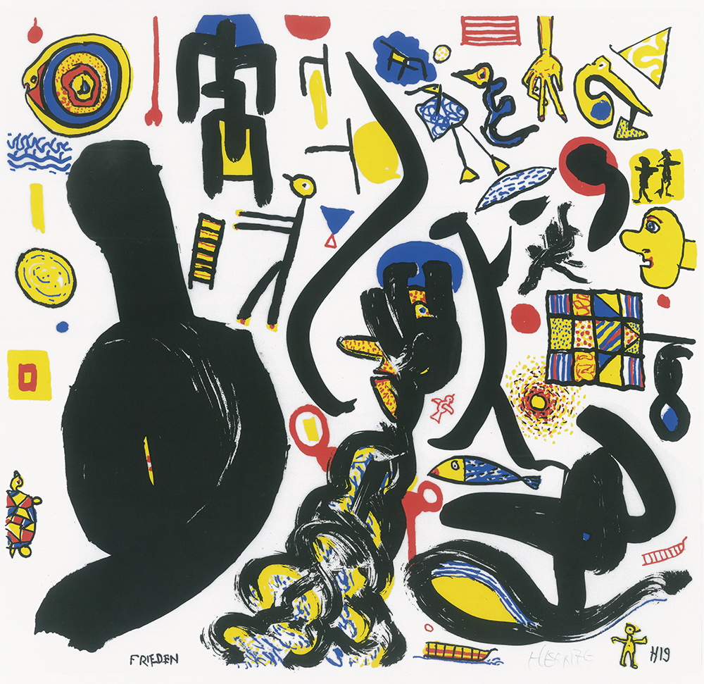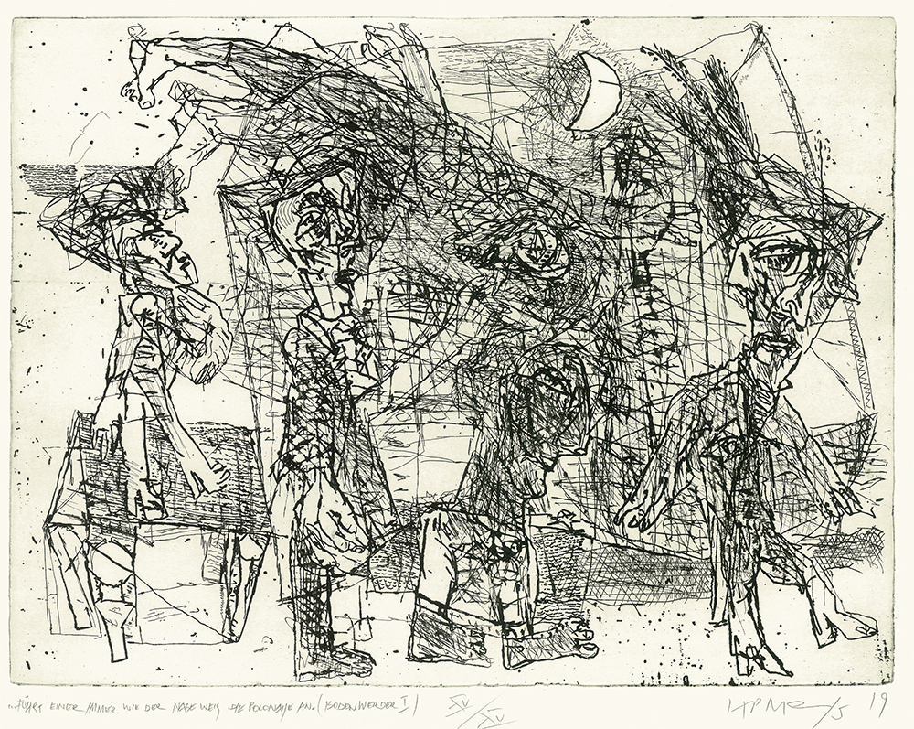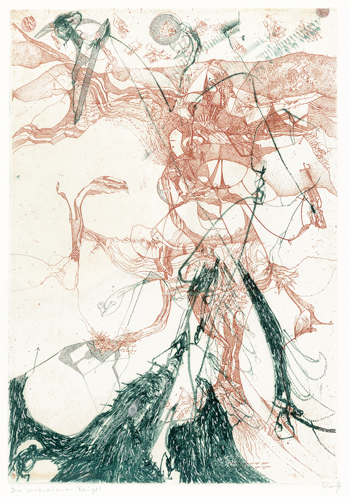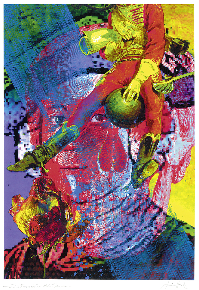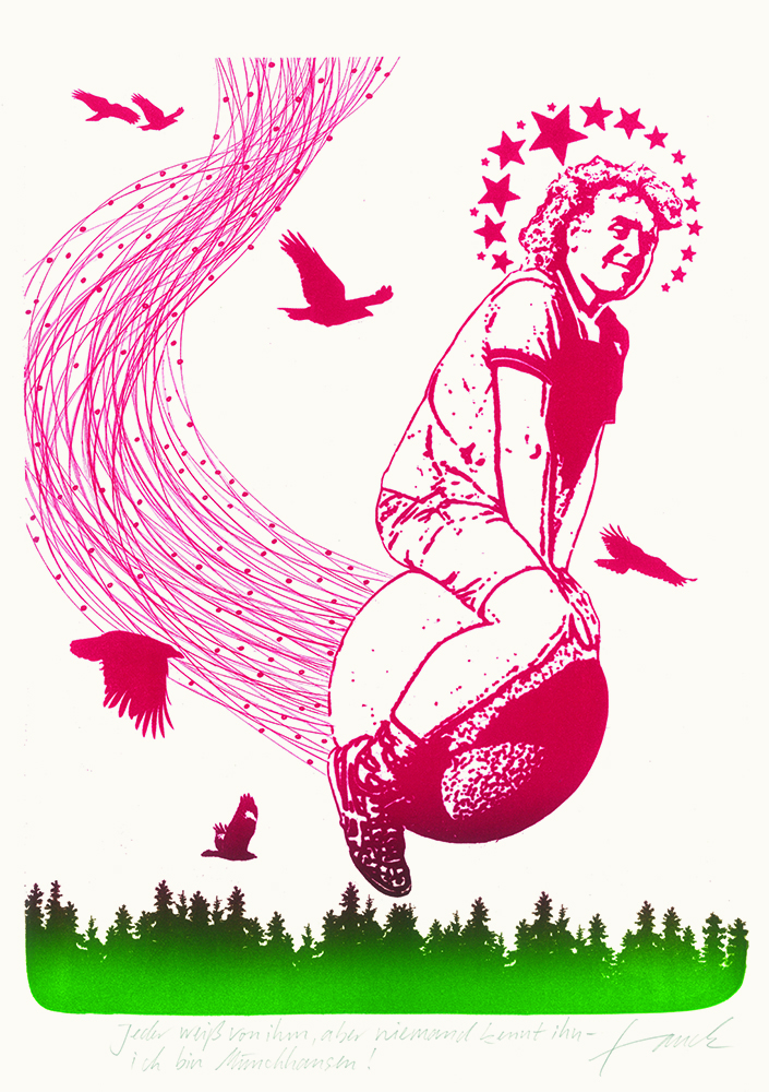 Anders als die ebenso legendären Volksbuchhelden Eulenspiegel, Robinson oder Gulliver besaß der Lügenbaron in Hieronymus Freiherr von Münchhausen einen historischen Urtyp und Namensgeber. Dieser wurde am 11. Mai 1720 in Bodenwerder geboren, wo er auch am 22. Februar 1797 gestorben ist. Unsterblich machte den brillanten Plauderer und Spötter ein Sammelband, der zum Weltbestseller aufstieg. Obwohl in Ichform erzählt, stammt keine einzige der darin vorgegaukelten Reisen zu Wasser und zu Lande, Feldzüge und lustige Abenteuer aus seiner Feder. Autoren der englischen und deutschen Erstausgaben waren vielmehr 1785/86 R. E. Raspe und G. A. Bürger. Früh bebildert, zieht das Buch noch immer zahllose Künstler in den Bann. Neben Illustrationen entstanden oft freie Blätter. So auch für die von der Anita und Günter Lichtenstein Stiftung herausgegebene Grafikmappe. Wie die von der 16. Ausgabe der Göpfersdorfer Kunstblätter begleitete Ausstellung im Kulturgut Quellenhof Garbisdorf vom 300. Geburtstag des Freiherrn veranlasst, vereint sie eine Elite prominenter Grafiker mit einer Auswahl jüngerer Talente. Wodurch die Mappe Einblick gewährt in die Vielfalt der Handschriften, Techniken und Bildideen heutiger Grafik. Die Spannweite reicht von zeitkritischer Brisanz – Alles da, nichts ist wahr – bis zur provokanten Identifikation: Ich bin Münchhausen. Was der Mappe hohen Reiz und Eigenwert verleiht.