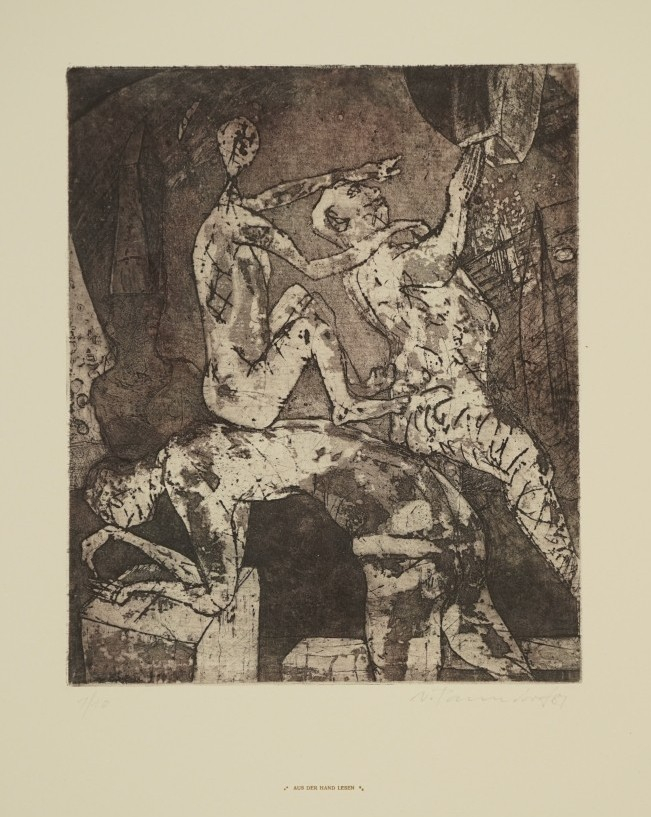 Galerie Aus der Hand lesenMappe: Panndorf U. "Deuter"Farbradierung/Aquatinta/Strichätzung, 29,8x24,5 50,5x39,0 cm, 1/10 1981Panndorf Ullrich