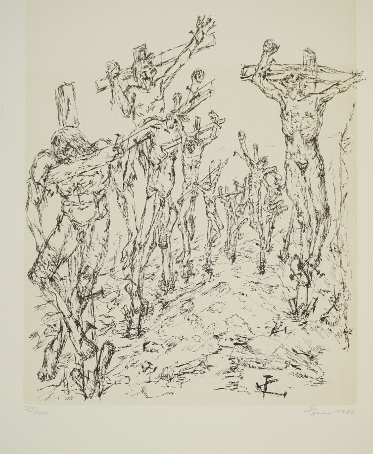 Galerie Bl.7 Die Straße von Capua nach Rom oder den Vorläufern des Mannes von Nazareth gewidmet IMappe: Cremer F. "Der Gekreuzigte" Verlags-Anstalt UnionLithografie, 37,0x3,0xx53,5x39,5 cm, 75/100 1985Cremer Fritz