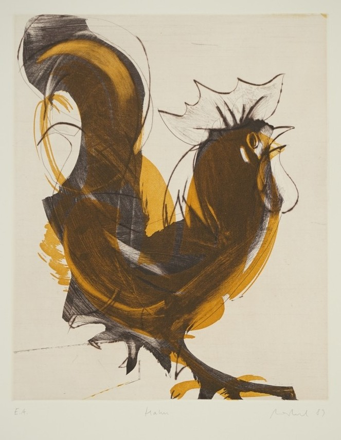 Galerie Bl.4 HahnMappe: Staatlicher Kunsthandel "Karl-Marx-Städter Tendenzen I"Aquatinta/Kaltnadel in 2 Farben, 39,0x32,0 53,5x39,5 cm, VI/X 1989Merkel Thomas