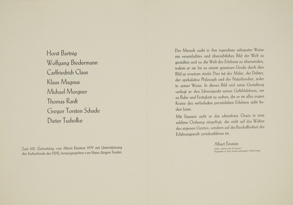 Galerie InhaltsverzeichnisMappe: Raum und Zeit Kulturfonds der DDR zum 100. Geburtstag von Albert Einstein1979Treder Hans-Jürgen