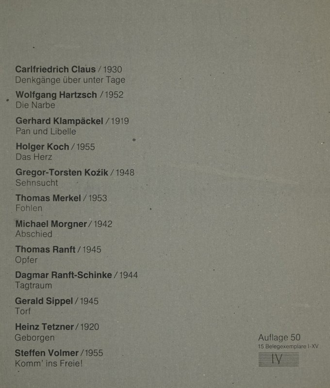 Galerie InhaltsverzeichnisMappe: Galerie "oben" 12 Lithografien und SerigrafienBuchdruck, 55,0x42,0 cm, IV/XV 1989n.N.