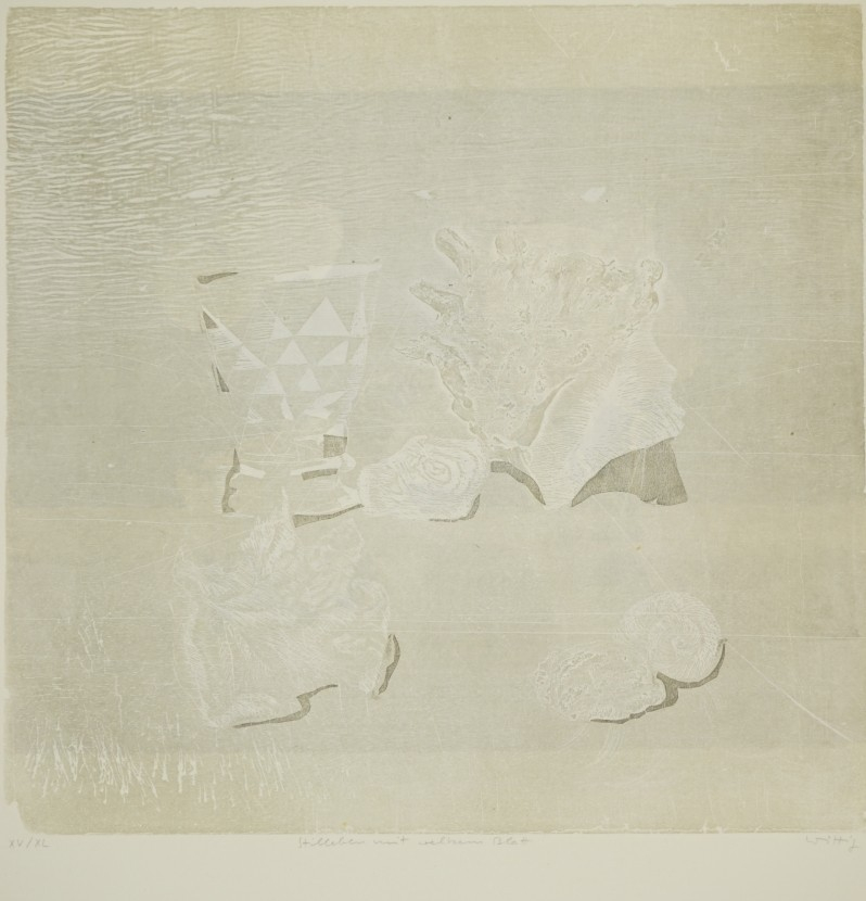 Galerie Stilleben mit welkem BlattMappe: Grafik-Presse "eikon" Wittig W. "Blatt Würfel Knospe"Farbholzriss, 41,5x41,5 61,0x49,0 cm, XV/XL 1976Wittig Werner