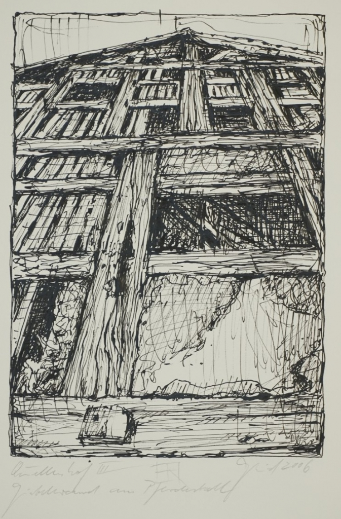 Galerie Quellenhof III Giebelwand am PferdestallFeder/Tusche, 29,2x20,5 50,0x41,0 cm, 2006Geist Peter