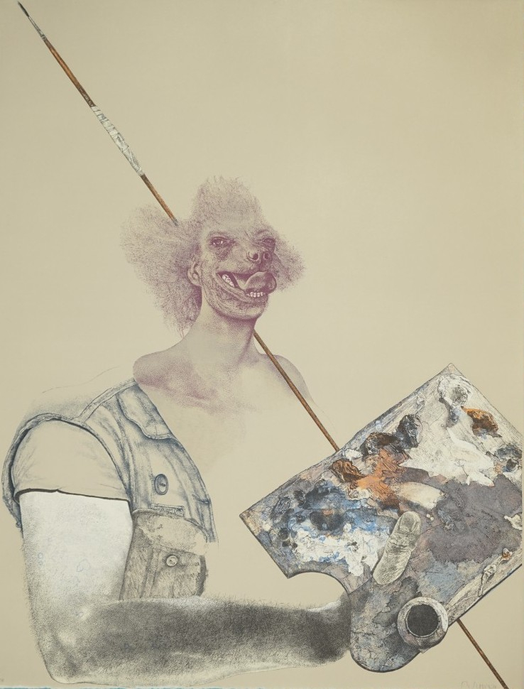 Galerie Selbst als Don QuichotteMappe: Galerie Stübler "Eine Arbeitsbegegnung bei Kätelhön"Farblithografie in 9 Farben, 65,0x50,0 cm, IV/XIII 1987Schwarz Reiner