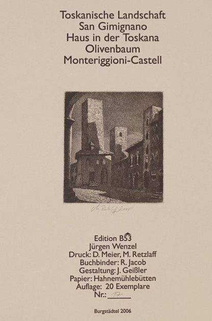 Galerie Impressum o.T.Mappe: B53 Retzlaff M. "Toskanische Landschaften"Radierung/Buchdruck, 10,5x9,3 35,5x39,5 cm, 17/320 2006Retzlaff Markus