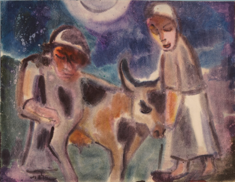 Galerie Paar mit Kuh im Mondschein / verso Junger MannAquarell, 50,0x64,3 cm, 80ziger JahreTetzner Heinz