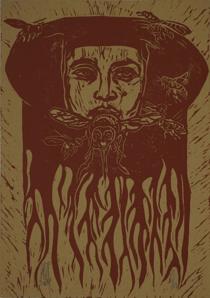 Galerie Blitz und Bienenkönig nach Beuys "Schwurhand Suite"Mappe: Verein Kunst Für Chemnitz Joseph Beuys "Hauptstrom"Holzschnitt, 42,2X30,0 cm, I/XV 2021Zemke Dagmar