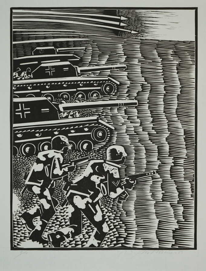 Galerie Bl. 2 (Panzer)Mappe: Mattheuer W. "Ein deutscher Lebenslauf"Holzschnitt, 45,2x34,7 54,0x42,0 cm, 9/10 1989Mattheuer Wolfgang