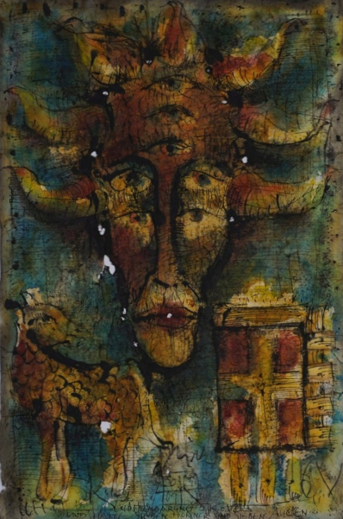Galerie "Offenbarung 5.K. 6.Vers "Und hatte sieben Hörner und sieben Augen"Mischtechnik, 49,6x32,6 cm, 2001Geist Peter