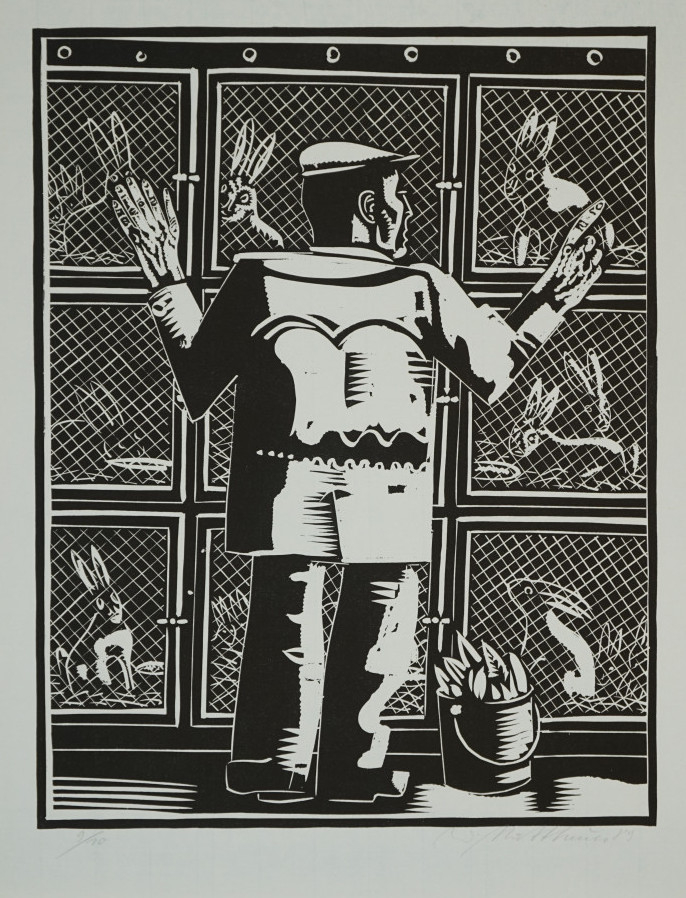 Galerie Bl. 12 (Mann vor Kaninchenstall)Mappe: Mattheuer W. "Ein deutscher Lebenslauf"Holzschnitt, 45,0x35,0 54,0x42,0 cm, 9/10 1989Mattheuer Wolfgang