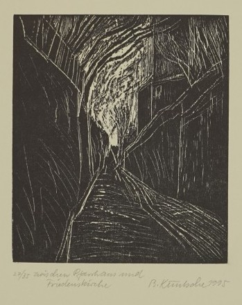 Galerie Zwischen Pfarrhaus und FriedenskircheMappe: 1645 Kötzschenbroda 1995Holzschnitt, 16,8x14,7 35,0x43,0 cm, 27/35 1995Kuntsche Bärbel