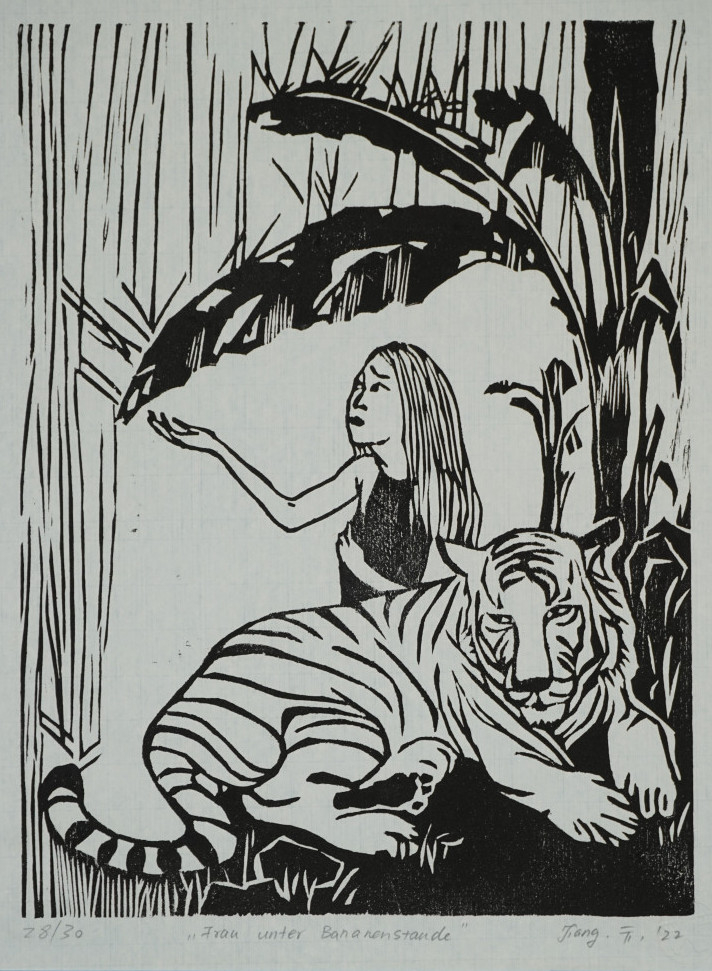 Galerie Frau unter BananenstaudeMappe: 21.HolzbildhauerpleinairHolzschnitt, 36,0x27,0 40,2x30,0 cm, 28/30 2022Bian-Harbort Jiang