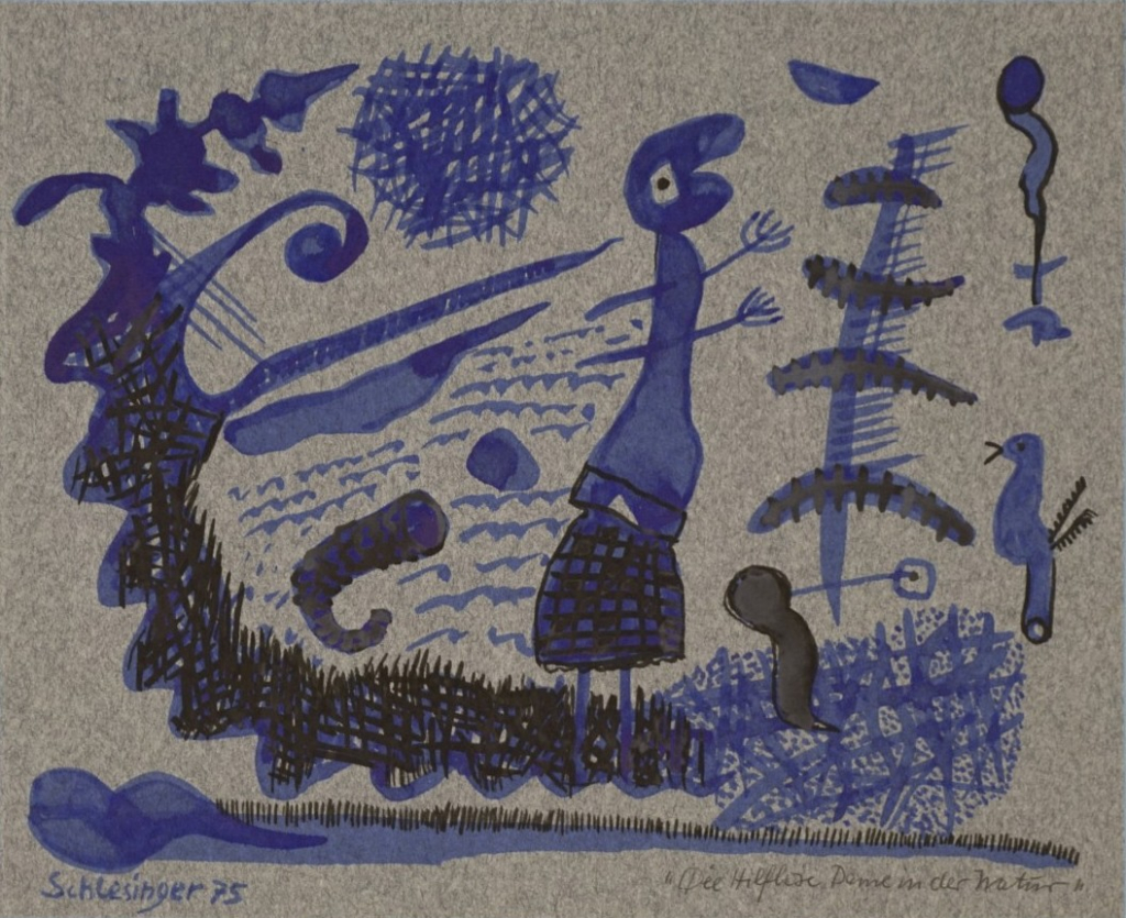 Galerie Die hilflose Dame in der NaturTusche blau, braun auf Papier, 22,5x27,5 cm, 1975Schlesinger Gil