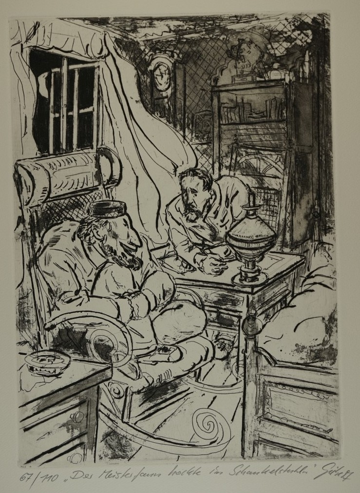 Galerie Der Meisterfaun hockte im Schaukelstuhl Bl.1Mappe: Reclamverlag Grafikedition XXVI "Für Erwin Strittmatter"Radierung, 34,3x24,5 48,3x36,0 cm, 67/100 1987Giebe Hubertus