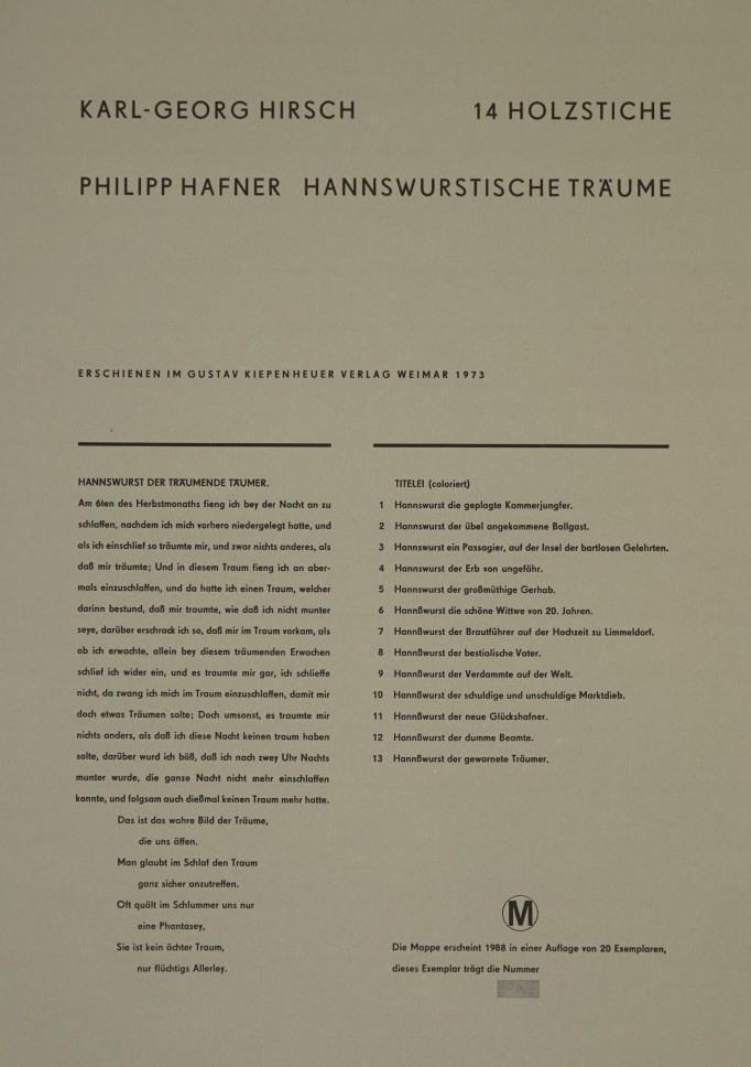 Galerie InhaltsverzeichnisMappe: Hirsch K.-G. "Hannswurstische Träume"Buchdruck, 48,0x34,0 cm, EA /20 1973Hirsch Karl-Georg