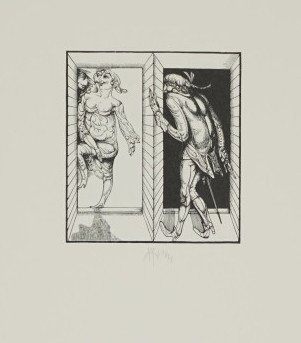 Galerie Hannswurst der übel angekommene BallgastMappe: Hirsch K.-G. "Hannswurstische Träume"Holzstich, 9,0x8,3 48,0x34,0 cm, EA /20 1973Hirsch Karl-Georg