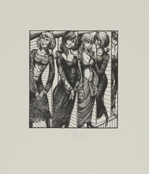 Galerie Hannßwurst der neue GlückshafnerMappe: Hirsch K.-G. "Hannswurstische Träume"Holzstich, 9,0x8,3 48,0x34,0 cm, Ea /20 1973Hirsch Karl-Georg