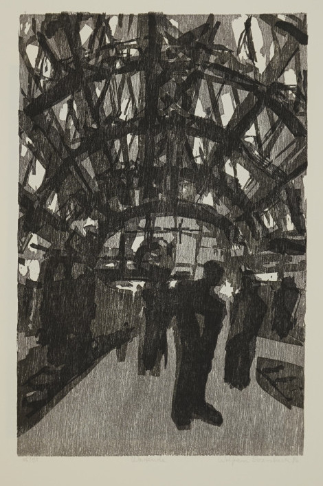 Galerie WartendeMappe: Mitteldeutscher Verlag "Der schmerzhafte und wunderbare aufrechte Gang"Farbholzschnitt, 35,7x23,4 55,0x39,0 cm, 35/50 1986Ebersbach Wolfram