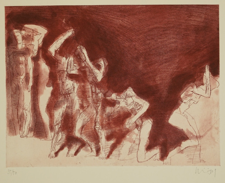 Galerie o.T.Mappe: Mitteldeutscher Verlag "Der schmerzhafte und wunderbare aufrechte Gang"Vernis mou/Aquatinta, 29,8x39,5 38,8x55,0 cm, 35/50 1987Schnürpel Peter