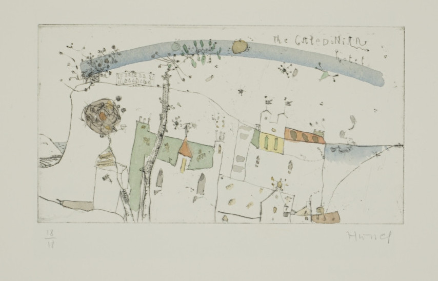Galerie Bl.1 Mappe: Hussel Horst "Tobermory" 34. Druck der Dronte-Presse Kaltndelradierung coloriert, 12,0x22,0 23,5x33,0 cm, 18/18 2000Hussel Horst