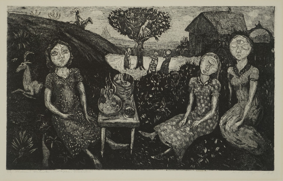 Galerie zu Grimm: Einäuglein, Zweiäuglein, DrieäugleinRadierung/Aquatinta, 23,3x37,5 38,5x50,0 cm, 1968Magnus Klaus