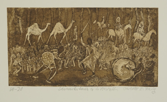 Galerie Schwerterkampf in der VorstadtMappe: Galerie Arkade "Hommage á Charlotte E. Pauly"Farbradierung, 17,0x32,2 39,0x50,4 cm, 1/20 1979Pauly Charlotte E.