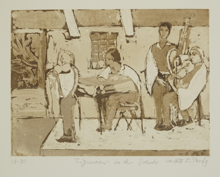 Galerie Zigeuner in der SchenkeMappe: Galerie Arkade "Hommage á Charlotte E. Pauly"Farbradierung, 25,0x33,5 39,5x50,0 cm, 14/20 1979Pauly Charlotte E.