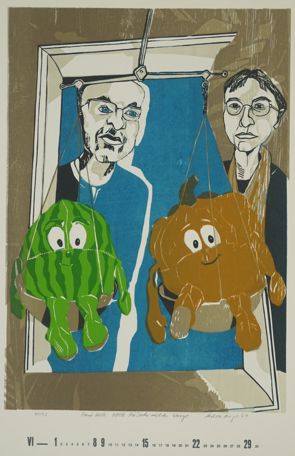 Galerie Feine Kerle ODER Die Sache mit der WaageFarbholzschnitt/Pappdruck, 50,0x42,0 59,5x47,0 cm, 41/42 2024Lange Andrea