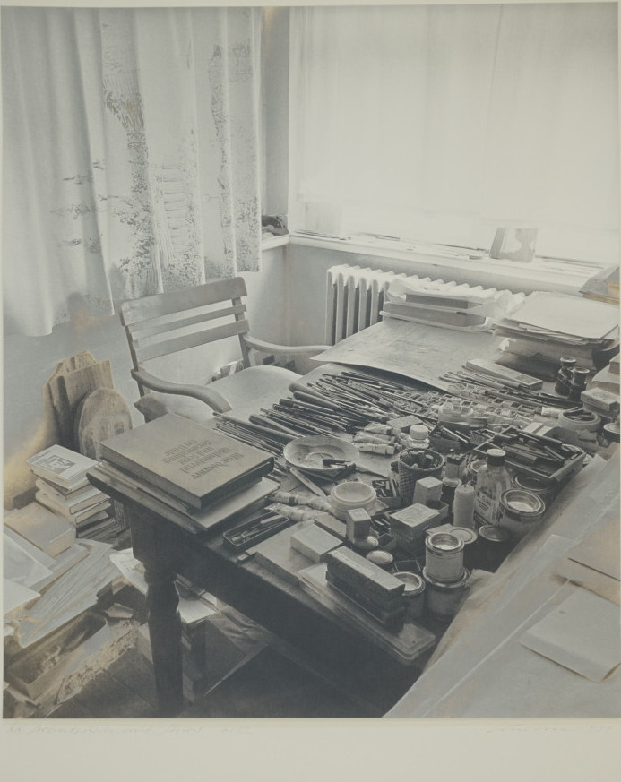 Galerie XIV Arbeitstisch mit StuhlMappe: Lindner U. Gerhard Altenbourg "Dies Haus als Aufgabe"Fotografie, 56,5x48,0 cm, 4/12 1991Lindner Ulrich