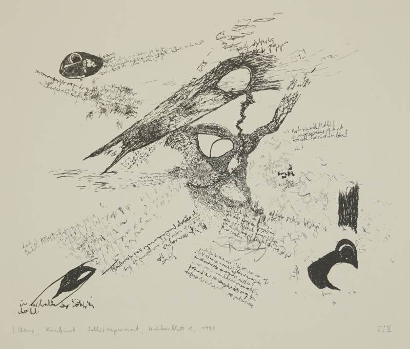 Galerie Kombinat: Selbstexperiment Nuklearblatt 1Mappe: Claus Carlfriedrich Work-BoxLithografie, 23,5x29,5 28,5x40,5 cm, I/X 1990Claus Carlfriedrich