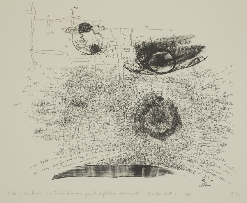 Galerie Kombinat: Im Diskontinuum mesokosmischer Zeiträume. Nuklearblatt 3Mappe: Claus Carlfriedrich Work-BoxLithografie, 22,0x27,0 28,5x40,5 cm, I/X 1989Claus Carlfriedrich
