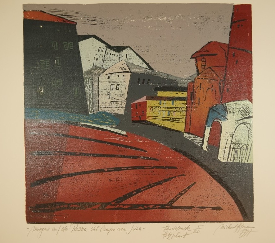 Galerie Morgens auf der Piazza del Campo von SienaMappe: Hoffmann M. "Ich will solange ich bin, …"Farbholzschnitt, 43,5x45,0 65,0x53,5 cm, 5/20 1997Hofmann Michael