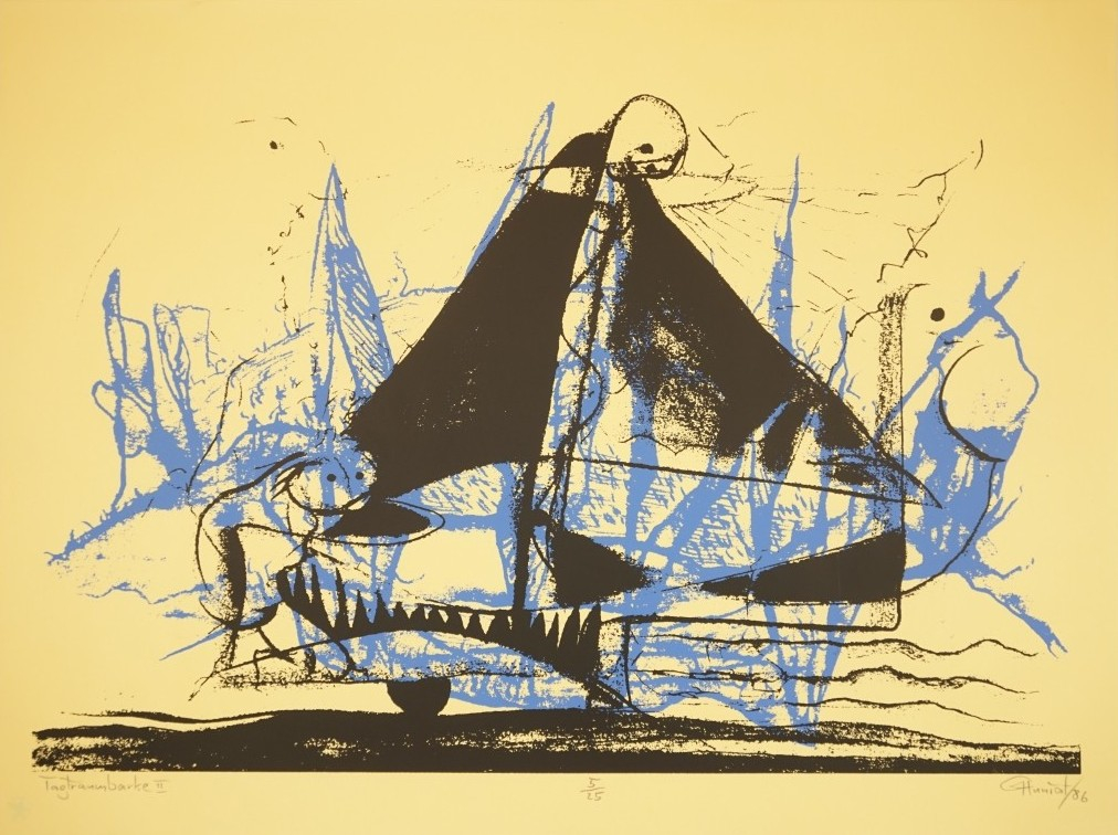 Galerie Tagtraumbarke IIMappe: EIGEN+ART Jubiläumsmappe 1 Jahr GalerieFarbsiebdruck, 2,0x45,0 36,1x48,0 cm, 5/25 1986Huniat Günther