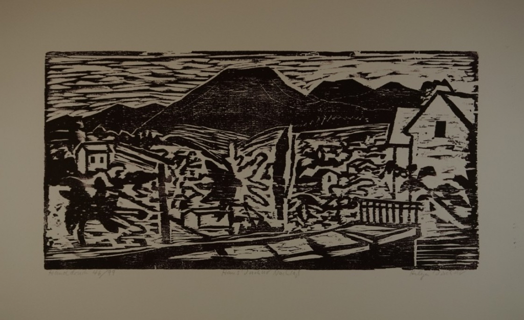 Galerie Bl. 2 Dorflandschaft vor BergenMappe: B53 Drei/93 "Der Holzschnitt"Holzschnitt, 53,5x40,0 22,0x43,7Nachl. cm, 46/100 1993Jüchser Hans