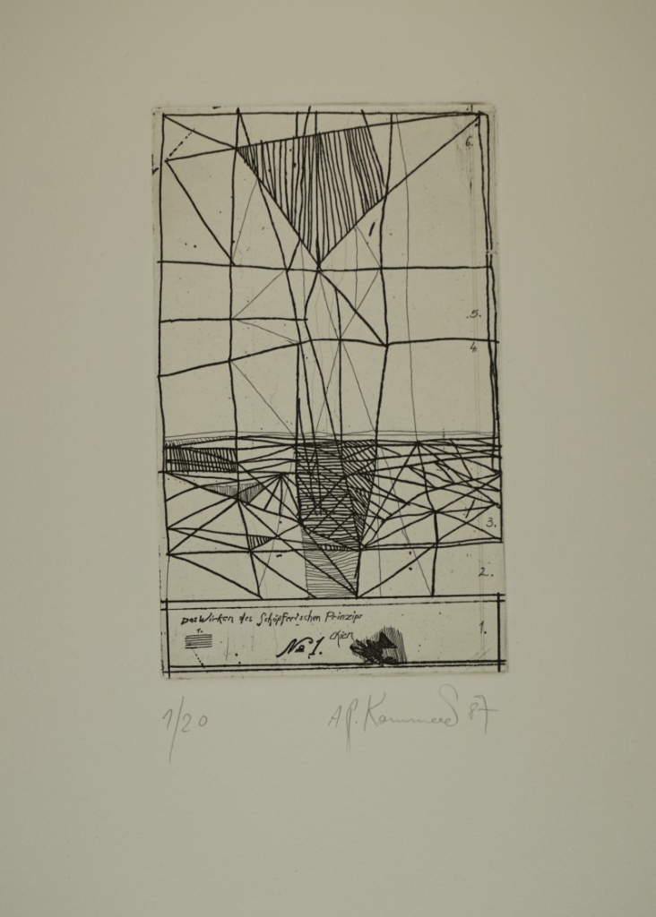 Galerie Bl.4 Das Wirken des schöpferischen Prinzips Nr.1Mappe: Kammerer A. P. "wer weiß, wie´s morgen wird"Radierung, 17,5x10,5 39,5x27,0 cm, 1/20 1987Kammerer Anton Paul