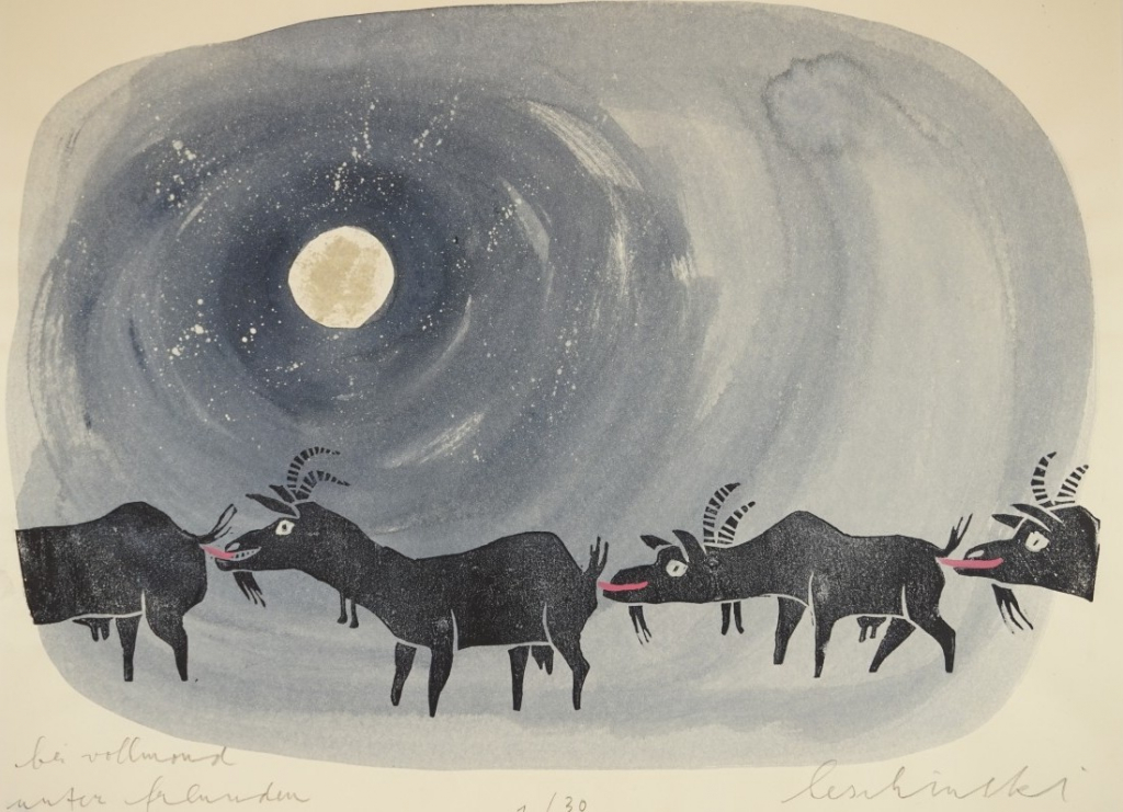 Galerie bei Vollmond unter …Mappe: 15.Holzbildhauerpleinaircolorierter Holzschnitt, 27,3x28,5 30,0x40,0 cm, 01/30 Leschinski Nora