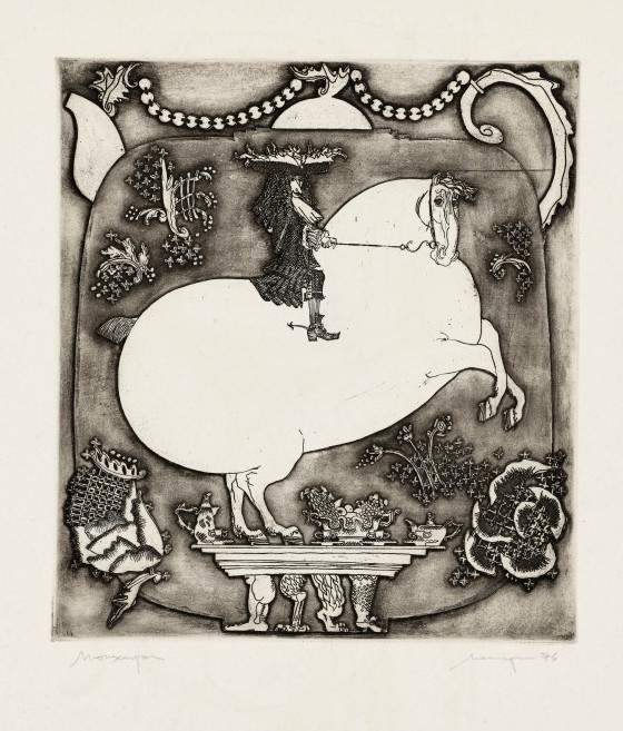 Galerie Bl.7 Abenteuer des Barons MünchhausenMappe: Grafik-Presse "eikon" Blätter aus LeningradRadierung, 31,7x28,5 64,5x50,0 cm, 3/100Majofis M.S.