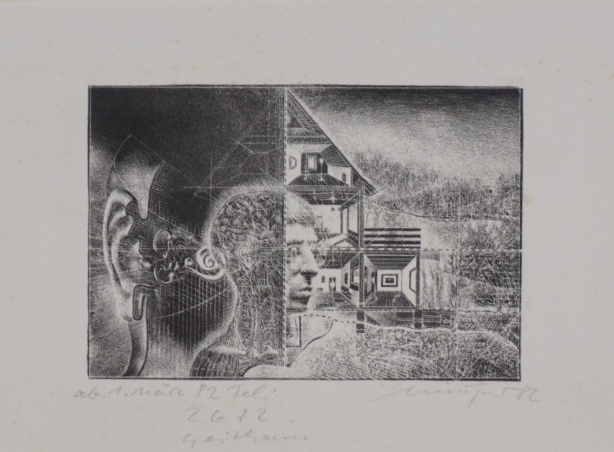 Galerie o.T. (ab 1. März 82 Telefon.: 2672 Geithain)Schablithografie, 7,5x11,0 11,5x19,5 cm, 1982Münzner Rolf