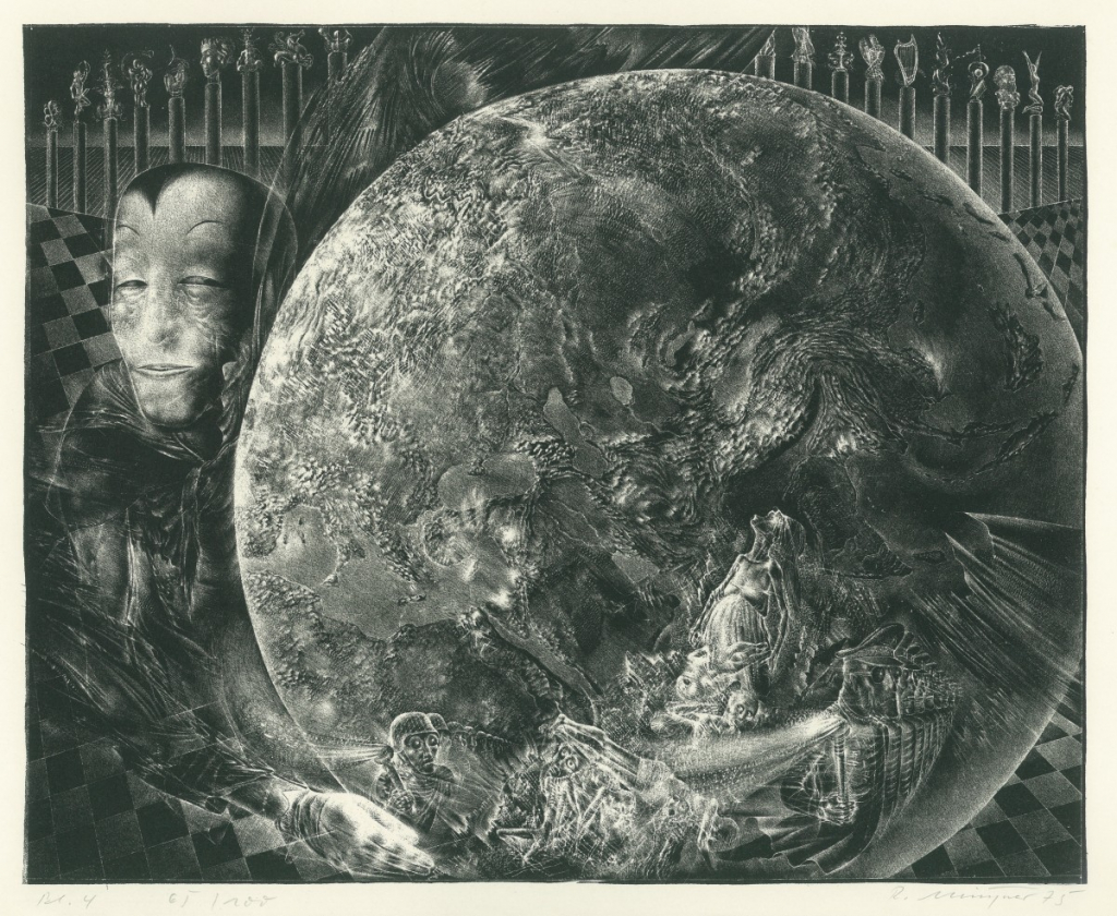 Galerie Bl.4 "Empfang beim Satan I"Mappe: Münzner R. "Der Meister und Margarita"Schablithografie, 23,7x29,5 36,5x48,5 cm, I 65/100 1974Münzner Rolf