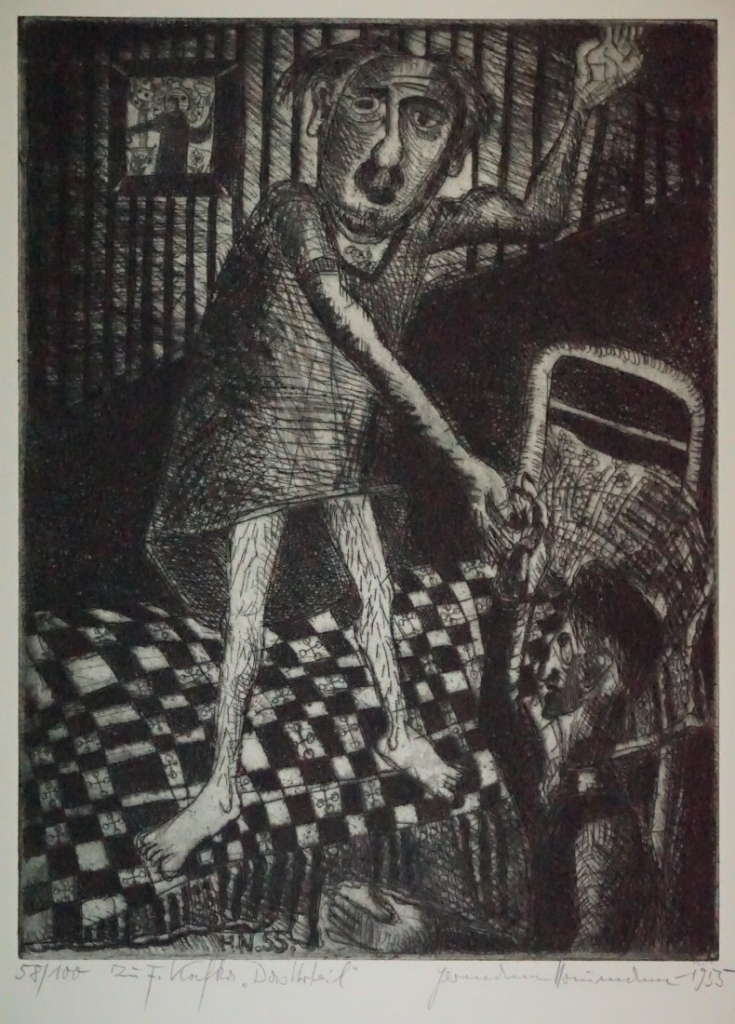 Galerie Das Urteil Bl.2Mappe: Reclamverlag Grafikedition XXI Naumann H. "Der Hungerkünstler"Radierung, 32,5x24,5 50,0x39,0 cm, 58/100 1955Naumann Hermann