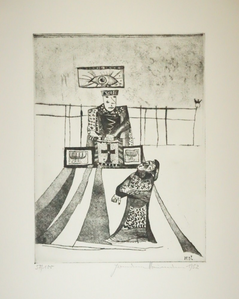 Galerie o.T. Bl.5Mappe: Reclamverlag Grafikedition XXI Naumann H. "Der Hungerkünstler"Radierung, 31,5x23,5 50,0x39,0 cm, 58/100 1952Naumann Hermann