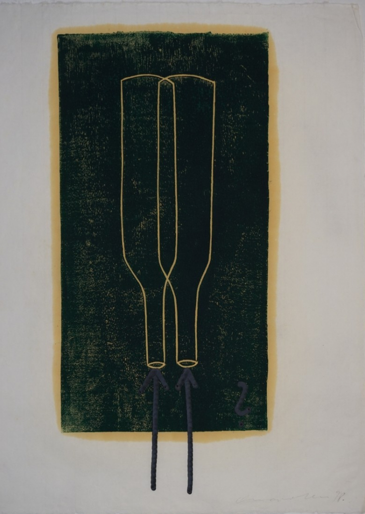 Galerie o.T. 2 Flaschen,2 PfeileFarbholzschnitt überzeichnet, 59,0x28,5 64,0x48,8 cm, 1998Osten Osmar