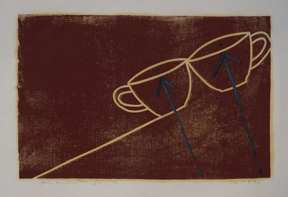 Galerie Nr.82 zwei braune TassenFarbholzschnitt überzeichnet, 33,5x51,5 48,5x63,5 cm, 2/4 1996Osten Osmar
