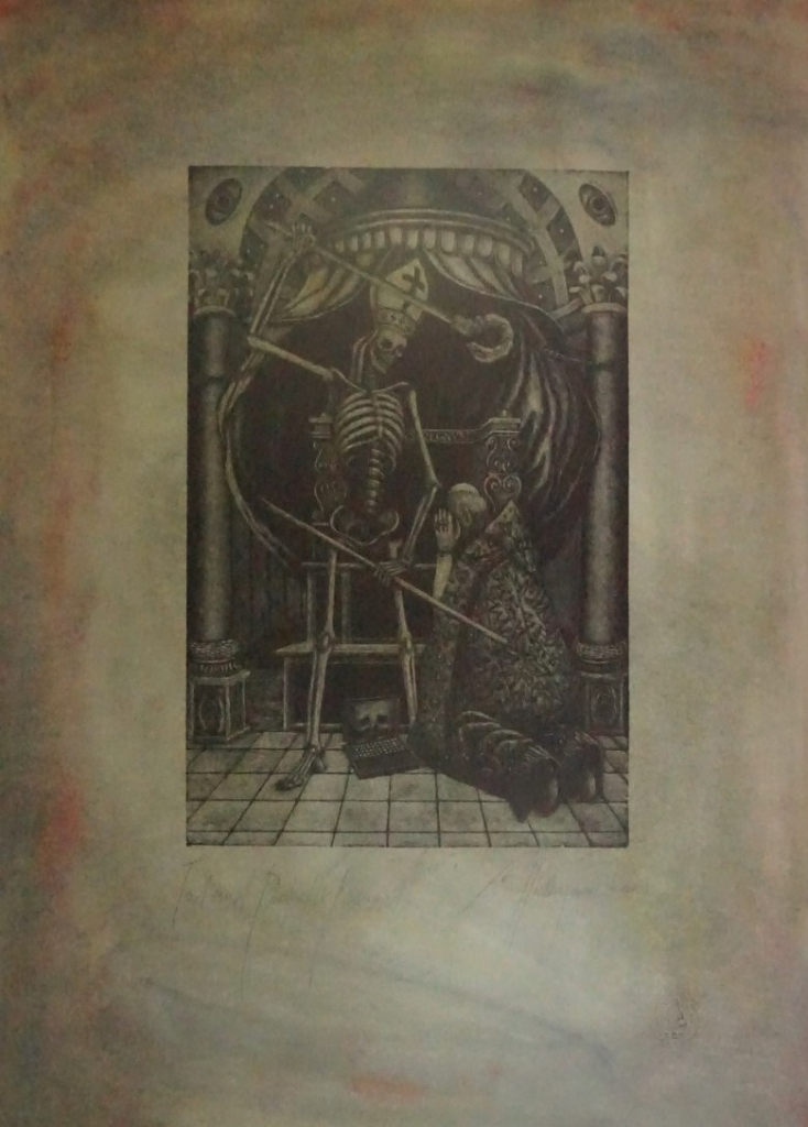 Galerie Bl.12 Tod und Pontifex MaximusMappe: Otto-Hüttengrund S. "Ein Totentanz"Holzriss, 27,4x17,8 47,5x33,8 cm, 3/8 2002Otto-Hüttengrund Siegfried
