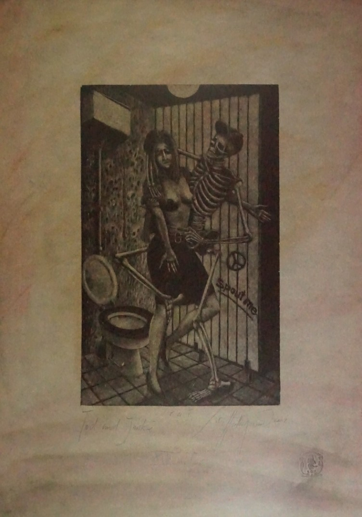 Galerie Bl.18 Tod und JunkieMappe: Otto-Hüttengrund S. "Ein Totentanz"Holzriss, 28,0x17,3 47,5x33,8 cm, 3/8 2002Otto-Hüttengrund Siegfried