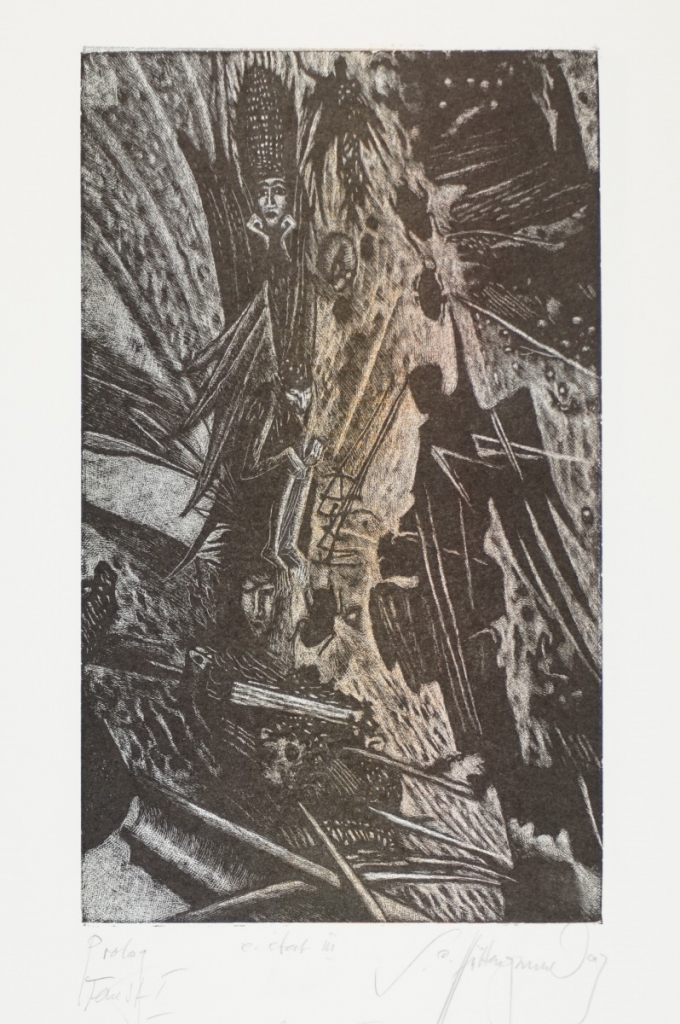 Galerie Bl.1 Prolog im HimmelMappe: Otto-Hüttengrund S. "Faust"Farbholzriss/Irisdruck, 21,0x12,8 36,5x27,0 cm, 2/30 2010Otto-Hüttengrund Siegfried