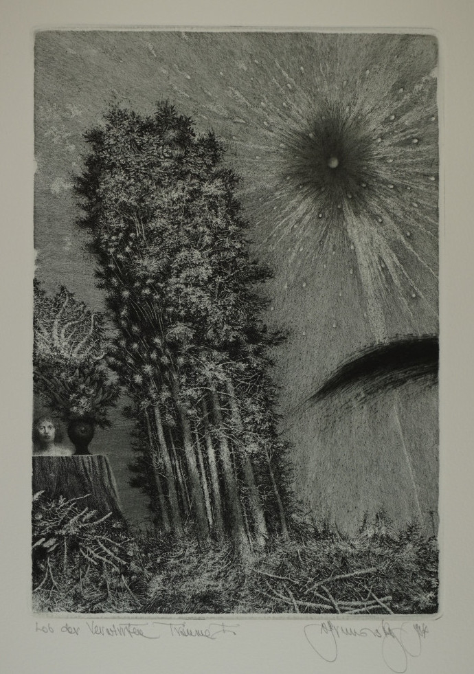 Galerie Bl.1Mappe: Grafik-Presse "eikon" Brunowsky A. "Lob der verwickelten Träume"Radierung, 25,5x17,5 52,0x39,0 cm, 30/50Brunowsky Albin