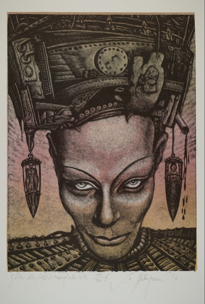 Galerie Bl.3 Göttin der SelbstmordattentäterMappe: 6.HolzbildhauerpleinairHolzriss/Irisdruck, 29,0x21,2 40,2x30,1 cm, II 13/30 2006Otto-Hüttengrund Siegfried